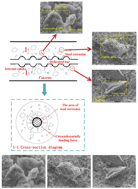 The bond force between the deformed steel and concrete is composed of a chemical adhesive force, friction resistance, and a mechanical interaction force. As shown in Figure 12 [24], the wedge effect of the transverse rib becomes more obvious with the increase in the relative dislocation between the reinforcement and concrete, which leads to an increase in the oblique pressure. The chemical adsorption force fails, and the friction resistance at the interface and the mechanical interaction force of reinforced concrete become the main components of the bond force. Glass products can replace natural fine aggregate to prepare concrete at a low substitution amount because of their own crushing index, density, and other properties close to those of natural sand and gravel. Although the surface of glass particles is smooth and the bonding force with cement is weak, this defect can be ignored when the substitution amount is small. The surface roughness of the broken glass fine aggregate increases, and the glass material itself has the properties of high hardness and high durability, so that the glass fine aggregate can make up for its own defects at a low amount. Glass sand possesses the characteristics of an irregular shape and multiple edges. Therefore, the addition of glass sand can help increase the roughness of the interface between steel and concrete, which improves the friction coefficient and thus enhances the friction resistance [10]. Glass sand with multiple edges and high hardness formed an interlocking system to significantly improve the mechanical bite effect. There is an interlocking effect between the glass sand, which is mainly caused by the shape characteristics of the glass sand. In addition, the shape of glass sand is narrower than that of natural river sand, so it has a certain inhibitory effect on the development of diagonal cracks [5].