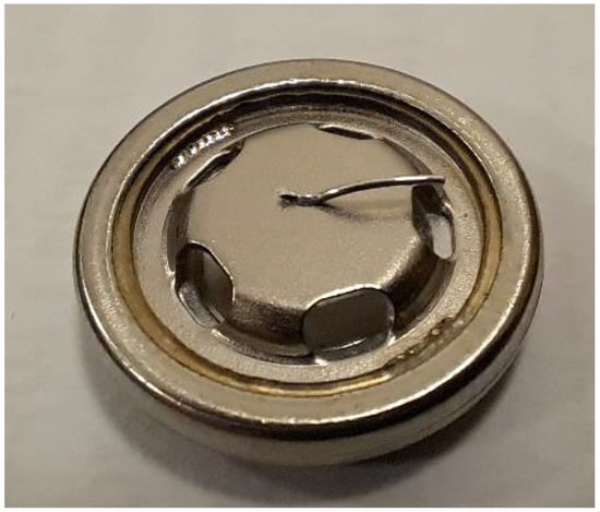 Wire bond visible on battery cap after cutting off top of battery cell.