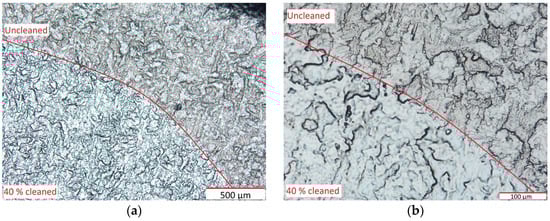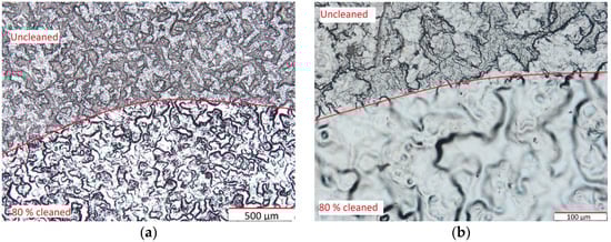 Boundary of the cleaned surface with ×50 (a) and ×200 (b) magnification for 80% laser cleaning power.