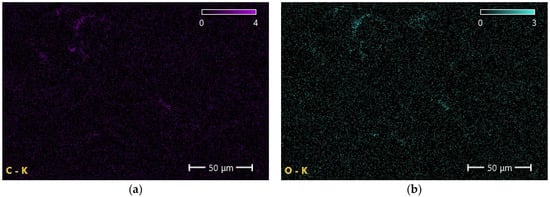 Distribution maps of elements visible in Figure 11 revealed large particles of iron visible on the sample surface. Patches containing heightened concentrations of carbon and oxygen have also been observed. Aluminum has also been detected in this sample in the same area as one of the foreign iron particles. Those results show that during the laser cleaning process, both types of contaminations—carbon and oxygen compounds and foreign metallic particles, are successfully removed.