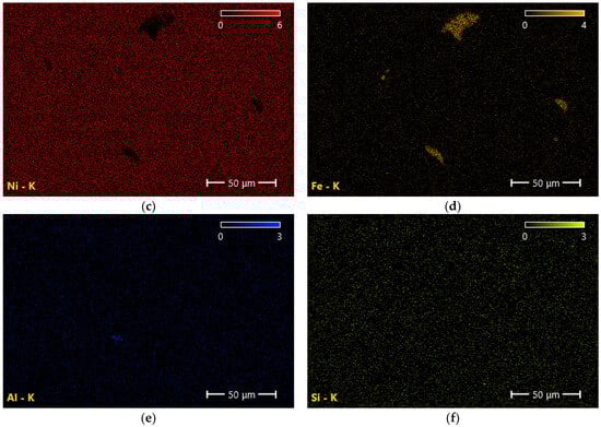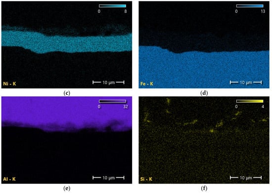 EDS count map of the 80% laser power cleaned sample bond cross section distribution of carbon (a), oxygen (b), nickel (c), iron (d), aluminum (e), and silicon (f).
