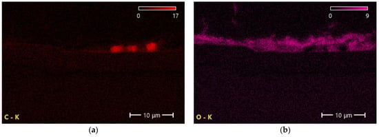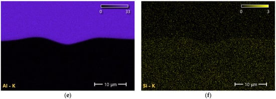 Count maps of the elements detected during the EDS analysis for this sample have been presented in Figure 13a–f. This revealed elevated concentrations of carbon, oxygen, and silicon. The elevated presence of carbon might be associated with the mounting powder penetration of the voids in the interface area during the mounting process and silicon can be associated with sample polishing. The oxygen map revealed a high amount of this element not only in the void between the materials but also in the material of the aluminum wire. This is probably due to contamination of the substrate surface that penetrated into the wire during the bonding process.