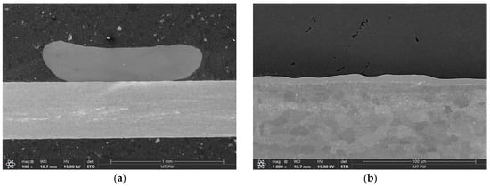 Cross sections of the bond made on the surface that was not laser cleaned seen in Figure 12a–c revealed a poor connection between the aluminum wire and the surface of the battery cell. Many gaps were observed in the area of the materials interface. The aluminum wire has been deformed to the shape of the substrate, but the connection did not occur. EDS has been performed on the cross section as seen in Figure 12d.