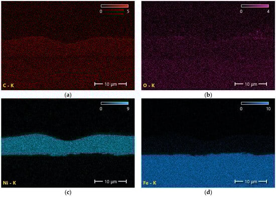 Cross sections of the sample made on the surface cleaned with 40% of the laser power seen in Figure 14a–c revealed a few small voids in the interface area. The voids were far smaller than on the uncleaned sample. Figure 14d shows quantity map of elements distribution within the sample measured by means of EDS.