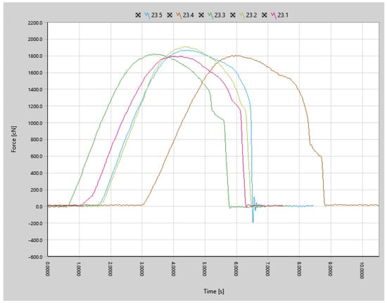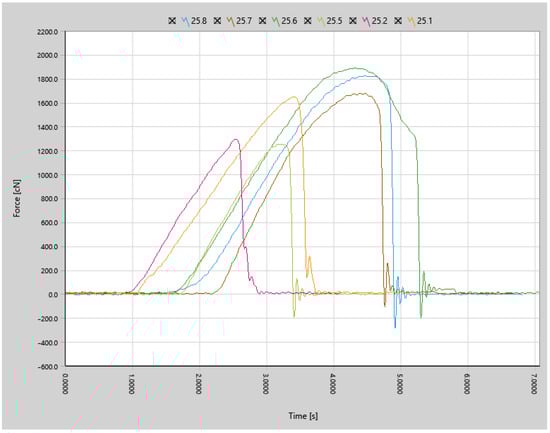 Shear test force curves for the 80% laser-cleaned sample have been presented in Figure 22 and are almost identical to the 40% cleaned sample. They are highly repeatable and have very similar shapes.