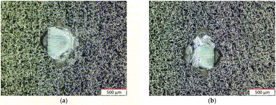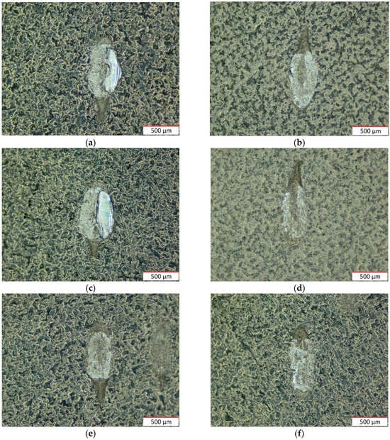 To further investigate the failure modes of the bonds during shear testing, light macroscopic photos have been taken. Bonds visible in Figure 19a,c show bond liftoff occurred in half of the bond area with the rest of the material being sheared at the shear line. Bonds visible in Figure 19b,d–f experienced full lift off of the wire. Those results indicate no proper nugget formation, poor bonding process performance, and low repeatability of the process.
