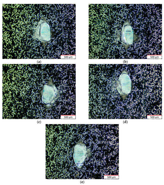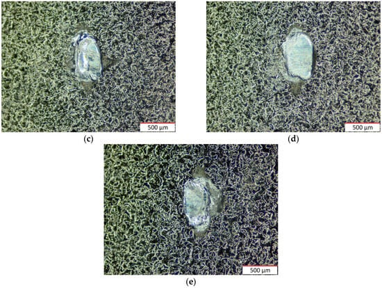 Light macroscopy images presented in Figure 21a–e revealed that the failure mode of the bonds made on the 40% laser-cleaned substrate is the shear of the aluminum wire material on or slightly below the shear line. This points to proper weld nugget formation, especially in the center area of the joint. This kind of failure is highly desired and confirms the positive influence of surface laser cleaning on the wire bonding process.