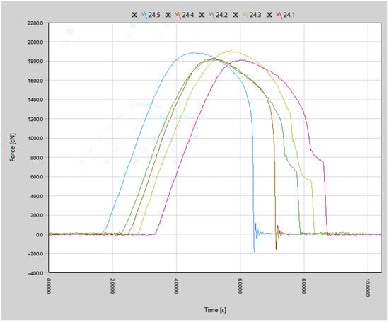 The shear test performed on the 40% laser-cleaned sample, which force curves have been presented in Figure 20, indicates that cleaning with this power of the laser beam greatly enhances the repeatability of the wire bonding process for the materials used in this study. Curves have a very consistent shape and size.