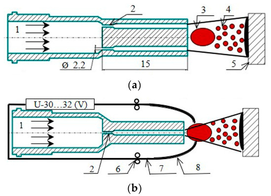 Schematic cross-section images of the metallizer nozzle for the formation of a supersonic spraying airflow (front view (a) and top view (b), respectively): 1—air flow, 2—critical section of a nozzle, 3—melt of electrode materials, 4—metal–air flow, 5—steel substrate with sprayed coating on the surface, 6—wires, 7—guides along which the electrodes are directed into the arc burning zone, 8—rollers for moving wire.
