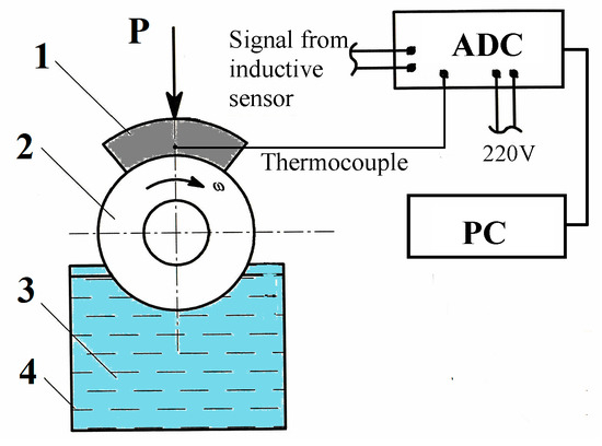 Scheme of the device for tribological investigations using the SMC-2 equipment: 1—counter body (segment), 2—disk specimen, 3—mineral oil; 4—bath for the oil. ADC—analog-to-digital converter; PC—personal computer.