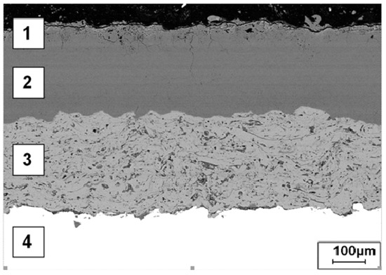 Typical microstructure in cross-section of specimen with PEO layer synthesized on ASC deposited using D16 wire: 1—technological PEO layer, 2—functional PEO layer, 3—remaining ASC, 4—D16 alloy substrate.