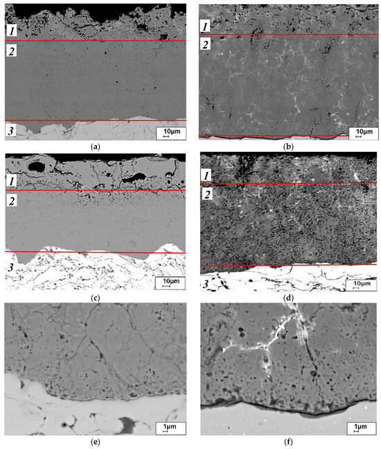 Microstructure of PEO synthesized on the surface of AMg6 (a) and D16 (b) alloys, as well as on the surface of ASC AMg6 (c,e) and ASC D16 (d,f), with sections of samples taken at low (a–d) and high (e,f) resolution. Red horizontal lines separate technological and functional zones of PEO layers from each other.