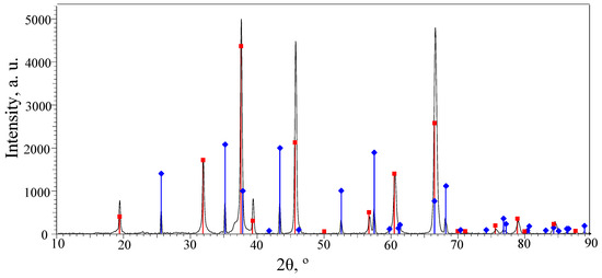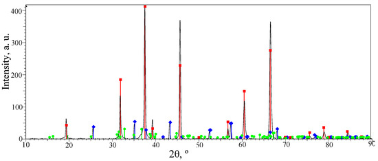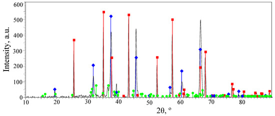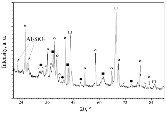 X-ray pattern obtained on the friction surface of a disk (made of D16 alloy with a copper content of more then 4 wt.% in its composition and with a PEO layer synthesized on ASC D16) during tribo-contact at a specific load of 10 MPa with a counter body made of ShKh15 steel with a hardness of 780 MPa in 15W30 motor oil with the addition of 2.5 vol.% glycerin: o—γ-Al2O3; □—σ-Al2O3; ■—CuAl2O4; ●—Cu; ×—CuO.