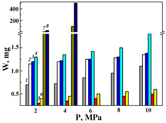 Average values of weight loss W depending on specific load P, determined for various counter bodies (segments) made of D16 (1) and AMg6 (2) alloys with PEO layers synthesized on their surfaces, as well as with PEO layers on the surface of ASC D16 (3) and ASC AMg6 (4) or made of steel with galvanic chromium plating (5), ShKh15 steel, heat-treated to a hardness of 780 HV (6) or 330 HV (7), as well as BrC30 bronze (8), obtained after 15 min of friction tests in I-20 mineral oil in a tribocouple with a disk made of D16 alloy with a PEO layer.