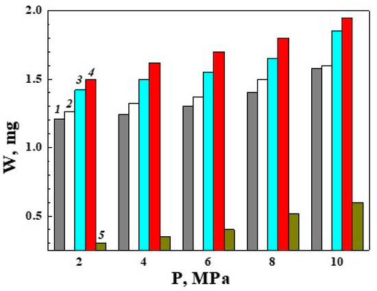 Average values of weight loss W depending on specific loads P, obtained for various disks made of D16 (1) and AMg6 (2) alloys with PEO layers synthesized on their surfaces, as well as with PEO layers on the surface of ASC D16 (3) and ASC AMg6 (4), or made of steel with galvanic chromium plating (5), after 4 h of friction tests in I-20 mineral oil in a tribocouple with a counter body made of D16 alloy with PEO layer.