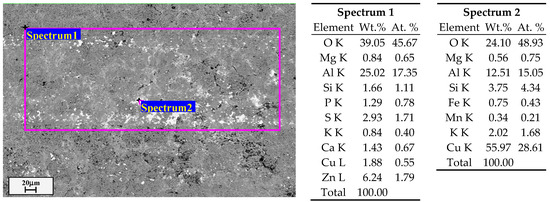 The method of X-ray spectral analysis revealed the segregation of copper particles on the friction surface of a disk (made of the D16 alloy with a PEO layer, synthesized on an ASC, sprayed with electrodes from the D16 alloy) paired with ShKh15 steel (Figure 13). X-ray phase analysis also confirmed the presence of copper and its compounds on the friction surface (Figure 14).