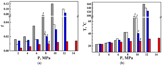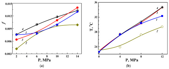Friction coefficient f (a) and tribo-heating temperature T (b), determined at different specific loads P during friction tests of a disk (made of alloy D16 with ASC D16, on top of which a layer of PEO was synthesized) in tribo-contact with a counter body (steel ShKh15 with a hardness of 780 HV) in pure glycerin (1) and in motor oil 15W30 with the addition of 5 (2), 2.5 (3) and 1 (4) vol.% glycerin.