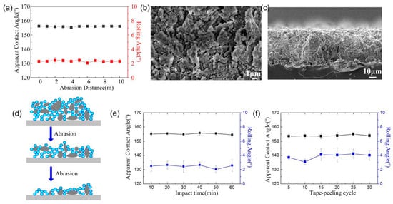 The mechanical durability of superhydrophobic coatings significantly influences their potential practical applications. This durability was assessed through sandpaper rubbing, falling water impact, and tape peeling experiments. Abrasion resistance is a primary concern for superhydrophobic coatings. Figure 2a demonstrates the superhydrophobicity of the coating after enduring a 10 m wear distance. The contact angle remains approximately 155°, with a roll angle of about 2.4°, showing minimal change compared to pre-wear conditions and continuing to exhibit excellent wetting resistance. As shown in Figure 2b,c, many rough micro- and nanoscale structures still exist on the rubbed surface. The excellent mechanical durability of the coatings is mainly due to their low surface energy, and the newly exposed areas still have micro/nanorough structures for superhydrophobicity (Figure 2d). In comparison to other single-step spraying methods, the wear resistance is notably improved. Zhang et al. [] utilized the single-step method for fabricating superhydrophobic coatings, which exhibited a loss of their superhydrophobic characteristics upon abrasion with 240-grit sandpaper over a distance of 0.6 m under a load of 1.6 kPa. The coating prepared by Zhi et al. [], using the single-step method, demonstrated a gradual decrease in contact angle as friction distance increased when subjected to 300 g weights and sanded with 600-grit sandpaper. The superhydrophobic coating developed by Wei et al. [] also experienced a loss of its superhydrophobic properties after undergoing 20 cycles of abrasion (Taber abrasion test, 250 g load, ASTM D4060 []). They postulated that once the rough surface structure was damaged by the sandpaper, the inner layer transformed into a flat surface primarily composed of resin due to embedded nanoparticles within the adhesive.
