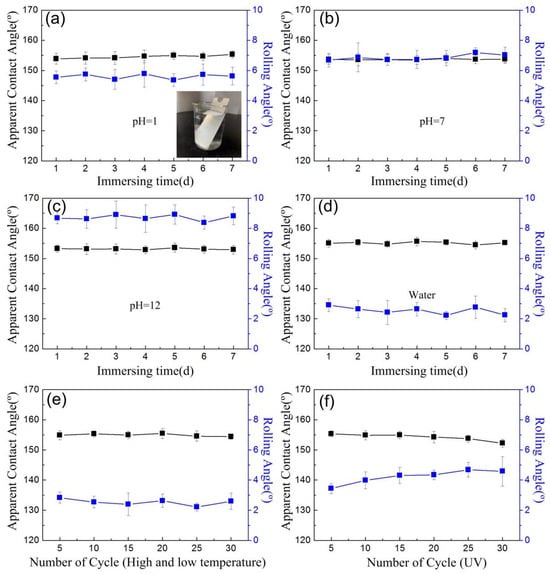 Effect of sample immersion time in (a) pH = 1, (b) pH = 7, (c) pH = 12, and (d) aqueous solutions on contact and roll angles; (e) effect of high and low-temperature testing on contact and roll angles; and (f) effect of UV irradiation on contact and roll angles.
