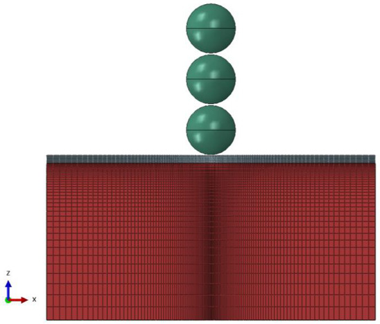 The multi-particle impact model of TiN/Ti multilayer coating was established with the ABAQUS software. The coating thickness was 24 µm, the modulation ratio was four, and the total number of coating layers was eight. The coating modulation ratio represented the ratio of TiN layer thickness to Ti layer thickness. In order to simulate the multi-particle impact process, three rigid, spherical particles were set up. According to the particle size analysis of the Taklimakan Desert sand [31], the radius of the rigid sphere was 75 µm. Figure 1 shows the schematic diagram of the geometric model, which adopts a 1/2 symmetric model and has a geometric size of 1000, 500, and 500 µm in length, width, and height, respectively. To improve simulation accuracy and reduce computational complexity, the mesh in the contact area between particles and coatings was densified, while the mesh in other areas was sparser. The plane along the length direction of the coating and matrix in the geometric model was set as a symmetric constraint (YSYMM), and the bottom and other sides of the model were set as full freedom constraints. The impact velocity of the particles was 100 m/s, and the impact angles were set as 15°, 30°, 45°, 60°, 75°, and 90°, respectively, and no contact was set among the three particles. The number of elements in the coating-matrix model is 512,044 (including 296,164 C3D8 elements and 215,880 COH3D8 elements), and the number of elements in a single particle is 1176 (including 840 C3D8 elements and 336 C3D4 elements). C3D8, COH3D8, and C3D4 are all grid element types in the ABAQUS software. C3D8 represents an eight-node linear hexahedral element, C3D4 represents a four-node linear tetrahedral element, and COH3D8 represents an eight-node three-dimensional cohesive element.