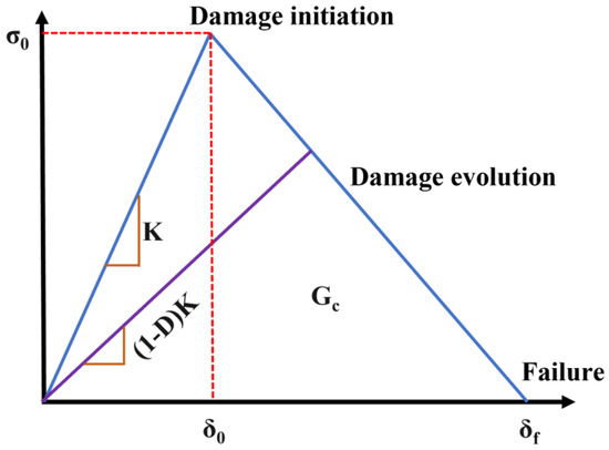 For hard coating, a bilinear cohesive element model based on the energy failure criterion was used. Zero-thickness cohesive elements were inserted into the TiN layer and the interface between the TiN layer and the Ti layer. The traction separation criterion was used to describe the deformation state between the internal elements of the particles. Figure 2 shows the constitutive relationship of the bilinear cohesive element model. When the cohesive region stress σ at the crack tip is equal to the interfacial strength σ0, damage occurs, and crack initiation occurs. Under the continuous action of an external load, cracks continue to expand, the stiffness of the material declines, and the bearing capacity weakens.