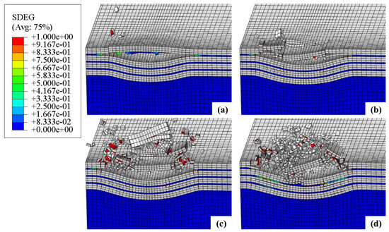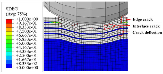 The output results of SDEG and JCCRT in the post-processing of the ABAQUS software indicate the damage of brittle materials and plastic materials, respectively, and the process of SDEG and JCCRT, increasing from 0 to 1, which indicates the process of material damage to complete failure. Figure 7 shows the characteristic cloud map of coating damage when multilayer coating is impacted. It can be seen that obvious edge cracks were generated at the particle contact edge, where the stress gradient of the coating was large and the tensile stress on the coating surface was high. At the same time, the coating produced interface cracks and longitudinal cracks under particle impact, and longitudinal cracks deflected and stopped at the interface, which indicates that the interface has the ability to hinder crack propagation. Figure 8 shows the stiffness degradation cloud image of the coating at different times during the particle impact process. It can be seen from the stiffness degradation cloud image that the coating cracking after impact is a gradual accumulation process. Firstly, micro-cracks occur in the TiN layer at the top of the coating in the contact area. As the impact progresses, the damage and failure of the Ti layer and the generation of interface cracks lead to delamination, while there are fewer cracks in other layers. After the first impact, serious failure and delamination of the coating occur only in the top Ti layer, while the subsequent impact increases the number of cracks in the impact area and the number of cracks in other layers. When the cracks expand and connect with each other, serious cracking and massive stripping occur.