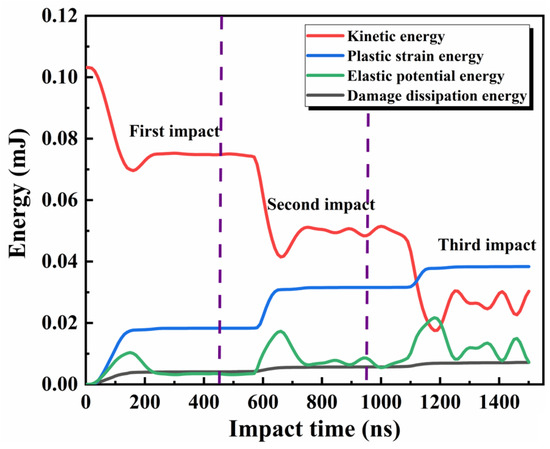 Figure 5 shows the energy changes in the entire model during the impact process, and it can be seen that there are three significant changes in kinetic energy, elastic potential energy, and plastic strain energy. The initial kinetic energy, including the three particles, is 0.103 mJ. In each impact, as the particles move to the lowest position and bounce off the coating surface, the kinetic energy first decreases and then increases, and the elastic potential energy first increases and then decreases, while the plastic strain energy and the dissipation energy of crack damage first increase and then remain stable. At the lowest position of particle movement, the elastic potential energy, plastic strain energy, and crack damage dissipation energy reach their maximum values. In the kinetic energy consumed after the first impact, plastic strain energy, crack damage dissipation energy, and elastic potential energy accounts for 58.9%, 13.2%, and 20.5%. The subsequent impact will increase the plastic strain energy and crack damage dissipation energy, but the increase in amplitude is small, which is consistent with the change law of the maximum particle displacement, indicating that the multi-particle impact process is a damage accumulation process. It can be seen from the figure that the kinetic energy and elastic potential energy fluctuate after the second impact, and the fluctuations are more pronounced after the third impact. The peaks and valleys of the two correspond to each other. This is because the coating is severely damaged and debris appears, causing collisions and compression between debris and between debris, as well as between debris and the coating, which affect the entire kinetic energy and elastic potential energy in the model.
