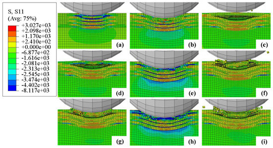 S11 stress cloud diagram of TiN/Ti multilayer coating during impact (MPa): (a) 50 ns; (b) 150 ns; (c) 450 ns; (d) 500 ns; (e) 650 ns; (f) 900 ns; (g) 1050 ns; (h) 1150 ns; and (i) 1400 ns.