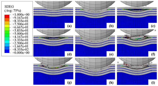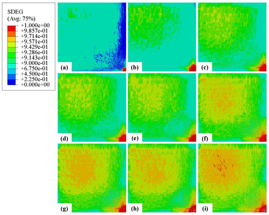 Local stiffness degradation of the top TiN/layer during impact (SDEG) clouds: (a) 50 ns; (b) 150 ns; (c) 450 ns; (d) 500 ns; (e) 650 ns; (f) 900 ns; (g) 1050 ns; (h) 1150 ns; and (i) 1400 ns.