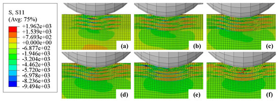 S11 stress distribution of TiN/Ti multilayer coating under different angle impacts (MPa): (a) 15°; (b) 30°; (c) 45°; (d) 60°; (e) 75°; and (f) 90°.