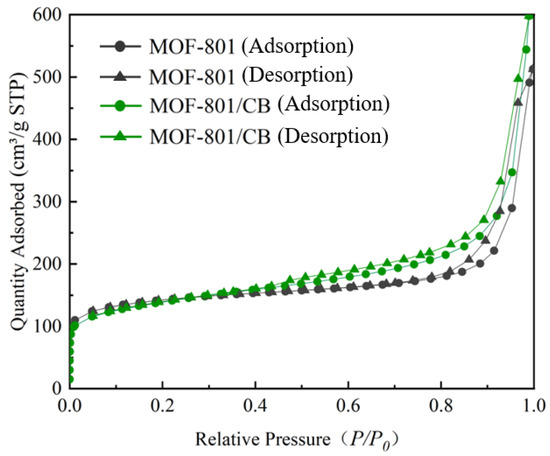 The N2 sorption isotherms at 77 K of MOF-801 and MOF-801/CB.