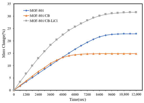 In order to compare the adsorption characteristics of the three adsorbents, three groups of samples were successively adsorbed to saturation at a temperature of T = 25 °C and a relative humidity of RH = 20%, and the experimental results are shown in Figure 4. Among these three materials, MOF-801 was almost saturated after 9600 s, with a mass change of 22.8% and an adsorption amount of 0.228 Kg of water per kg of MOF, which is recorded as 0.219 kg/kg, similar properties to those of MOF-801 reported by Yaghi et al. [16,18]. MOF-801/CB was saturated at 7200 s, with a mass change of 14.9% and an adsorption amount of 0.149 kg/kg, while MOF-801/CB-LiCl was saturated after 10,800 s, with a mass change of 31.6% and an adsorption capacity of 0.316 kg/kg.