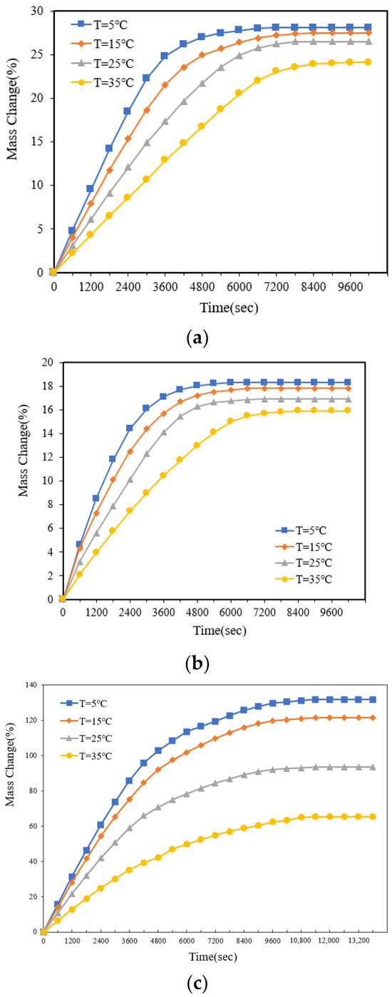 The ambient temperature will also have a great influence on the performance of the adsorbent. In order to investigate the adsorption characteristics of the composite adsorbents under different temperatures in detail, adsorption tests were carried out on MOF-801, MOF-801/CB, and MOF-801/CB-LiCl successively. The environmental parameters were set as RH = 60% and T = 5 °C, 15 °C, 25 °C, and 35 °C; the change in the working mass of the adsorbent was recorded until it reached saturation; and the experimental results are shown in Figure 6.