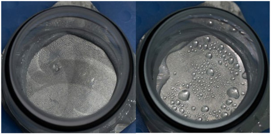 The device consists of two parts, the top and bottom, which are assembled in the center by means of threads for easy disassembly for sample processing. The threaded joints are sealed by gaskets to maintain a tight seal inside the device during the desorption process. The outer wall is made of acrylic material, which ensures the structural strength and facilitates the processing of the structure; has a high thermal resistance and light transmission capacity to ensure that the Petri dish is fully illuminated during the experimental process; and reduces the heat exchange between the outer wall and the surrounding environment to maintain the stability of the temperature of the samples in the Petri dish. The bottom of the device was sealed with acrylate adhesive and an aluminum sheet, and a plastic holder was used to separate the Petri dish from the bottom of the device. When desorption experiments were conducted, the device was placed on a temperature-controlled cold source to facilitate the full heat exchange between the bottom surface and the cold wall, so that the resolved water vapor could condense quickly at the bottom of the device without affecting the temperature of the adsorbent in the Petri dish, and the condensation effect of the water-cooled wall in the process of desorption is demonstrated in Figure 8.