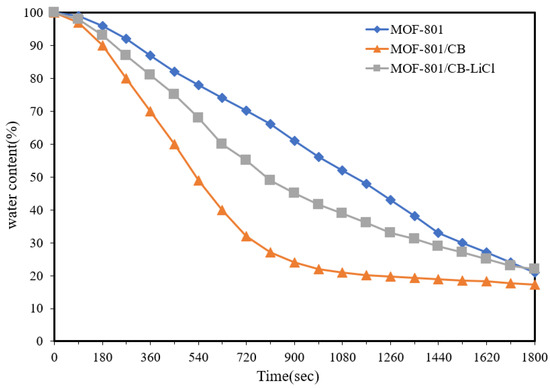 It can be seen that the addition of CB improved the adsorption rate of the adsorbent in the early stage of adsorption, but the effect on the microstructure of MOF-801 made the maximum moisture adsorption of the adsorbent decrease by 34.9%. After the addition of LiCl, which improves absorption characteristics, the adsorption capacity and adsorption rate of the adsorbent were greatly improved compared to the other two adsorbents, with an increase of 38.2% compared to MOF-801 and 112.3% compared to MOF-801/CB under the conditions of T = 25 °C and RH = 20%.