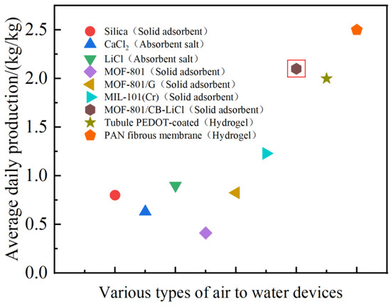 A comparison of the average daily water production of the intermittent air water extraction device based on the MOF-801/CB-LiCl composite adsorbent and other air water extraction devices is shown in Figure 10, which indicates that the water extraction of this device(In the red box) is higher than most adsorbents, such as silica gel, hygroscopic salt (CaCl2), and MOF-801, but still lower than hydrogel PAN fiber membranes. However, the preparation and processing of hydrogel PAN fiber membranes based on the modification of the microscopic molecular structure is complicated, the yield needs to be improved, and the stability needs to be further verified. Therefore, the MOF-801/CB-LiCl composite adsorbent, which is only physically mixed, shows better application potential due to the advantages of a higher average daily water yield, simple processing, and good stability.
