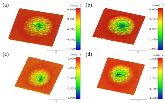 The ablation morphologies of 3D reconstructed C/SiC and C/SiC-ZrC are shown in Figure 4. The center ablation region, transition region, and edge region can be roughly seen from the 3D morphology. Figure 4a,b show the morphologies of C/SiC after ablation for 30 s and 60 s, respectively, and the distribution of yarns can be seen, with a large number of discontinuous fibers exposed. The depth of the pits increases with the increase in ablation time. Figure 4c,d depict the morphologies of C/SiC-ZrC after ablation for 30 s and 60 s, respectively. Compared with the C/SiC morphology, the central ablation area of the C/SiC-ZrC surface is smaller than that of C/SiC. The yarn distribution is not visible, with fewer exposed fibers, and the ablated surface is flatter. With the increase in ablation time, the depth of the pits also increases. Under the same ablation time, the depth of the pits in C/SiC-ZrC is smaller than that in C/SiC, so the linear ablation rate of C/SiC-ZrC is smaller than that of C/SiC. It can be seen that the ablation resistance of C/SiC-ZrC is better than that of C/SiC.