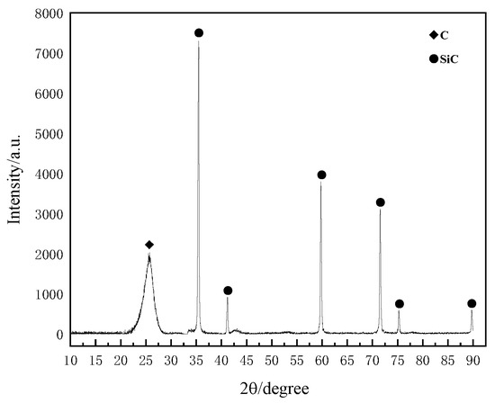 The X-ray diffraction pattern of the ablated surface of the C/SiC is shown in Figure 7. From this, it can be observed that the surface of the C/SiC after ablation consisted of C and SiC, and there is no diffraction peak indicating the presence of a SiO2 material phase. The primary reason is that during the high-temperature ablation process, the surface of the material heated up rapidly, exceeding the boiling point of SiO2 (2230 °C). This led to the direct evaporation and sublimation of SiO2, either due to the high temperature or the reaction with oxidizing gases during the sublimation process, resulting in the formation of volatile SiO. Additionally, the transition region of SiO2 may not be detectable due to its low degree of crystallization [31]. Similarly, the transition zone SiO may not be detected due to the low degree of crystallization.
