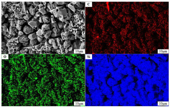 Figure 8 shows the microscopic morphology of the C/SiC material matrix after ablation. After ablation, the C/SiC matrix exhibited a granular shape, broken into an irregular organization. EDS analysis was conducted on the matrix portion of the ablation center to detect the elements present. The instrumental results indicate that the matrix was covered with C, O, and Si elements, with a more uniform distribution of oxygen elements. This suggests the formation of a silicon–oxygen compound on the surface.