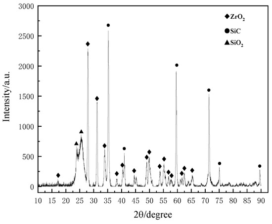 The C/SiC-ZrC specimens also underwent chemical reactions during the ablation process, and Table 5 lists the possible reactions of the C/SiC-ZrC material, in addition to the potential chemical reactions of the C/SiC material. Detailed observation of the surface of the C/SiC-ZrC composite material revealed a distinct difference between its micro-morphology and that of the C/SiC after ablation. Figure 11 shows the XRD pattern of the ablated surface of C/SiC-ZrC, from which it can be seen that the compounds detectable on the surface of the C/SiC-ZrC material after ablation at nearly 3000 °C were ZrO2, SiC, SiO2, and ZrC. The ZrO2 peaks are particularly prominent, indicating a higher content of ZrO2.