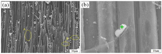The fibers not covered by ZrO2 oxide are exposed on the surface, as shown in Figure 13a. Fibers parallel to the surface have been partially broken under the action of the high-speed air flow and have left erosion traces. As shown in area A of Figure 13a, the fibers are no longer intact and cylindrical. The broken fiber area has spikes, and there are particles of different sizes attached to the surface. As shown in area B of Figure 13a, accompanied by the uneven distribution of thermal stress during the heating process of high-temperature airflow, cracks appeared on the fiber surface. Figure 13b is a magnified image of the fiber surface, and it can be clearly seen that the fiber surface is no longer cylindrical. Analysis of the energy spectrum through the position of the green symbol of Figure 13b, the proportion of Si, Zr, and O in the white substance attached to the fiber was found to be 45.59%, in which the content of Si is higher than that of Zr. The white substance is a mixture of SiO2 and ZrO2. The SiO2 oxidized by SiC has a low viscosity and is easily dispersed by the high-speed airflow, forming small agglomerates. Figure 13d is a scanning electron microscope image of fibers perpendicular to the surface. The fiber bundles of yellow circle in Figure 13dare needle-punched carbon fibers with sharp or obtuse shapes at the fiber ends, and it can be seen that the oxyacetylene flame has thermo-mechanically stripped the fibers perpendicular to the surface.