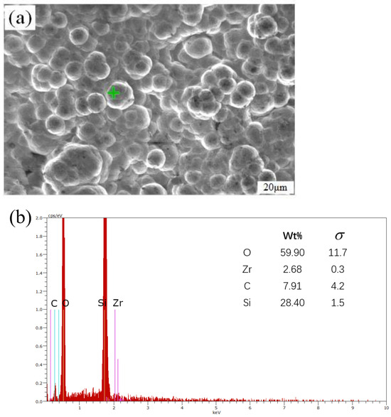 Figure 14 shows the micro-morphology of the transition region, and Figure 14a displays the morphology of the substrate in the transition region. It can be observed that cracks have appeared on the surface of the substrate, which were caused by thermal stress resulting from the mismatch of thermal expansion coefficients between the substrate and the surface oxide layer during the cooling process. At the same time, there are numerous bubbles and pits on the surface of the substrate. The gases inside the bubbles were CO and SiO, produced during the ablation process. Under high pressure, the pressure difference between the inside and outside of the bubbles exceeded the surface tension, which led to the rupture of the bubbles and the escape of the gases to form pits. The pits were partially filled by silica in the fused state but did not finish filling. Figure 14c shows the EDS analysis of the green symbol in Figure 14b, which shows that the content of Zr elements is very low, while the content of O and Si elements is 92.21%. This indicates that the surface of the ablation transition zone is dominated by silica, mainly due to the flow of silica on the surface formed by oxidation of the silicon carbide substrate at high temperatures, and the ZrC in the coating has not melted but is covered by the fused silica.