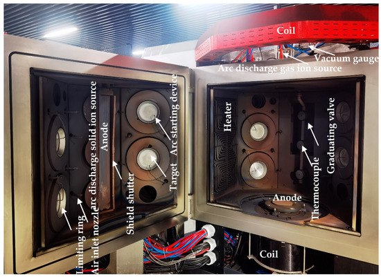 Figure 1 shows the structure diagram of the production-type arc ion plating coating machine. CrAlN and CrAlBN coatings are prepared on polished high-speed steel (S390) specimens (16 mm × 15 mm × 3 mm) and shaper cutters by home-made arc ion plating coating machine (as shown in Figure 1). The material of the shaper cutter is the same as that of the specimens, which is shown in Table 1. The arc ion plating coating machine is equipped with 8 vacuum arc sources and 3 vacuum arc etching sources. Al0.7Cr0.3 and Al0.63Cr0.27B0.1 targets were used to prepare CrAlN and CrAlBN coatings, respectively. After ultrasonic cleaning, the specimens and shaper cutter are armored to the workpiece frame to realize two-dimensional rotation. After the pressure of the vacuum chamber is pumped to 3.0 × 10−3 pa, the heating is turned on, and the temperature is kept at 500 °C for 60 min. Before etching the shaper cutter and specimens, Ar are first introduced into the vacuum chamber. After the pressure in the vacuum chamber is stable, the three arc ion sources start to work. Plasma etching was applied to the surface of the test piece and gear shaper cutter (the specific parameters are shown in Table 2). Plasma treatment can remove pollutants or low energy substances on the surface of the substrate, promote the activation of the surface of the substrate, and thus improve the surface energy and adhesion effect [43]. After the etching is completed, N2 is injected into the vacuum chamber, the coating is deposited after the pressure is stabilized at 3.5 Pa. To enhance the adhesion strength, CrAlN and CrAlBN adhesion layers are deposited with a target current of 130 A and bias voltage of −40 V, for 30 min. The working layers of CrAlN and CrAlBN are deposited with a target current of 130 A and bias voltage of −60 V, for 150 min. Table 3 lists the specific experimental parameters of the deposition of coatings.
