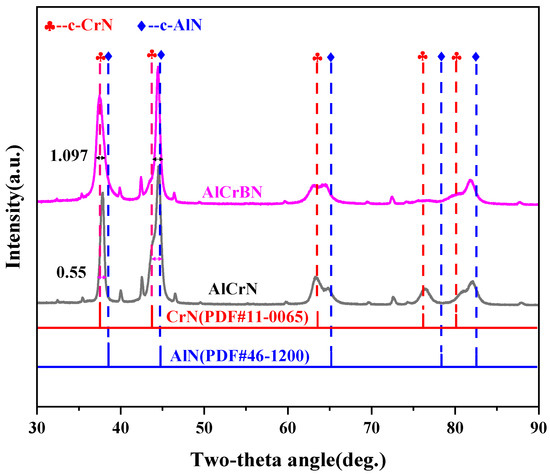 Figure 2 shows the XRD patterns of CrAlN and CrAlBN coatings. It can be found that the position of the diffraction peak of CrAlN coating appears between the peaks of standard AlN (PDF#46-1200) and CrN (PDF#11-0065) with higher intensity, forming a metastable fcc-NaCl type structure of CrAlN, which is consistent with previous results [44,45].