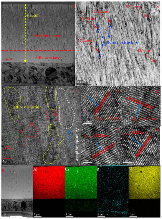 By comparing the HRTEM of CrAlN and CrAlBN coatings (Figure 3c,f), it was found that there were a large number of displacements, lattice bending and other defects along with contrast caused by internal stress in the CrAlBN coatings (Figure 3f). The crystals of BNx were not found in the HRTEM image (Figure 3f), instead, an amorphous phase was observed. Combining the XRD analysis results (Figure 2) with the cross section scanning results of the CrAlBN coating (Figure 3g), it can be determined that the B element and its compounds exist in the amorphous form in the CrAlBN coating.