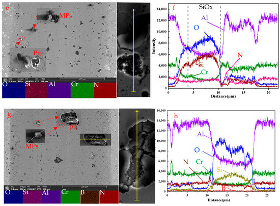 As shown in Figure 6a,b, micro-particles (MPs) and pits appear in the wear tracks and collapse occurred at the edge of the crater. The appearance of pits is caused by the defects of the coating itself. According to the EDS analysis results (Figure 6f,h), the particles are mainly Si and O elements, and also Si and O elements also appear at the edge of the pits. Si element is mainly from the counter-ball (SiN) used in the friction and wear experiment, and O element is mainly from the oxidation during the friction and wear process. MPs and the debris generated by pit collapse will participate in the grinding process of the coating and the grinding ball, and aggravate the wear of the coating. The results show that there are adhesive wear and abrasive wear in the process of friction and wear.