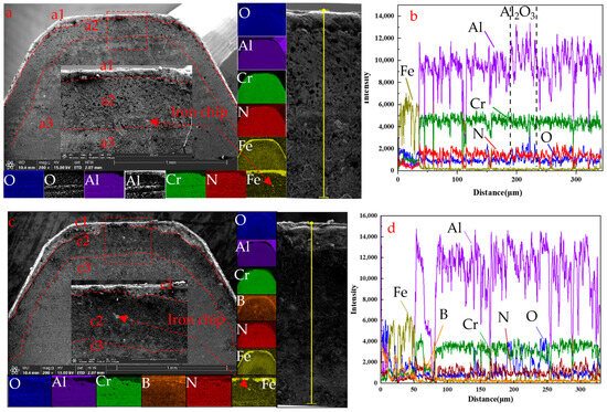 Figure 10a shows the cutting-edge morphology of CrAlN and CrAlBN coatings shaper cutter. It is clear that all coated shaper cutters present similar failure modes in the cutting-edge including boundary wear and edge damage because the shaper cutter is a forming processing tool. As such, boundary wear is the main reason for its failure. According to the SEM image of cutting-edge morphology of the CrAlN-coated shaper cutter (Figure 10a), it can be found that abrasive wear appears (a-1). Due to the high hardness of CrAlBN coating, the abrasive wear phenomenon of the CrAlBN-coated shaper cutter (b) has not been observed [64]. It can be found that the iron chip number of CrAlN-coated tools (a-2) is significantly greater than that of CrAlBN-coated tools (b-1), this indicates that the anti-diffusion wear performance of CrAlBN coating is better than that of CrAlN coating. The cracks (b-1) were only found in the CrAlBN coating, which is caused by the fatigue of the coating during the cutting process.