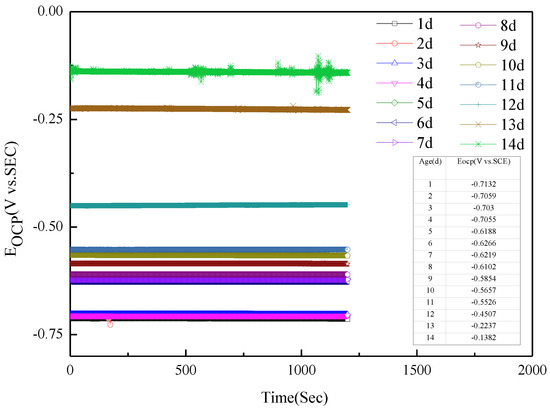 Figure 1 presents the open-circuit potential (Eocp) of Q235 steel in sand containing HA solution under natural air drying. It is stable with time. With the increase in age, that is, the decrease in moisture content in the sand, the Eocp of Q235 steel in sand gradually-positively skews.