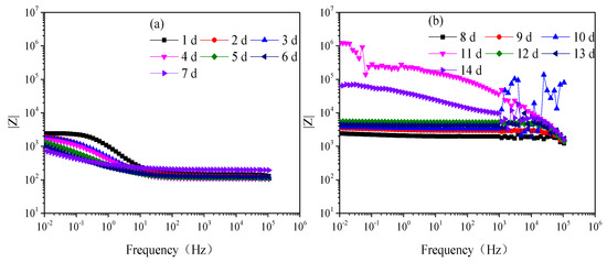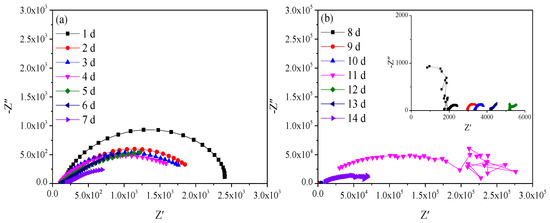 Nyquist diagram of Q235 steel in sand containing HA solution: (a) 1 d–7 d; (b) 8 d–14 d.