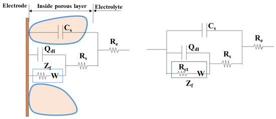 To further study the characteristics, the non-fluctuation part of the impedance spectra of Q235 was fitted by the equivalent circuit Re(Cs(Rs(Qdl(RctW)))) (Figure 5) according to the characteristics of the modulus and phase angle [15]. The fitting results are shown in Figure 6 and Figure 7 and Table 4, which are obtained by the fitting software ZSimDemo 3.30d. Figure 6 and Figure 7 show that the fitting effect of the equivalent circuit is good.